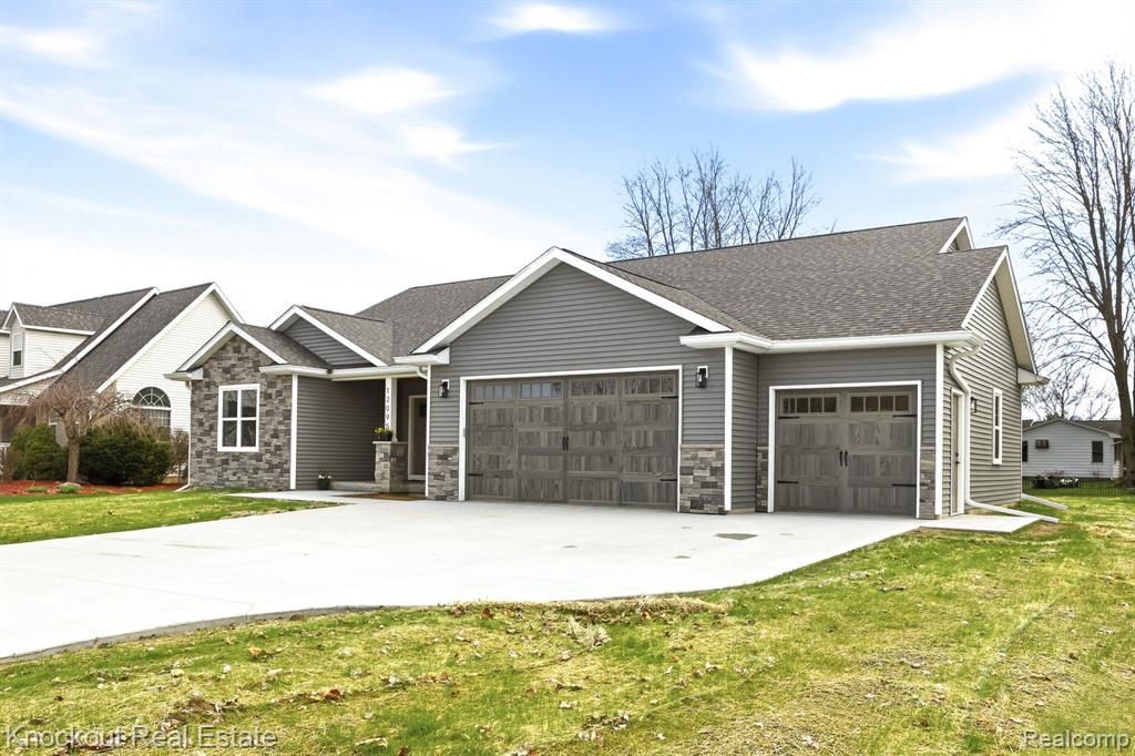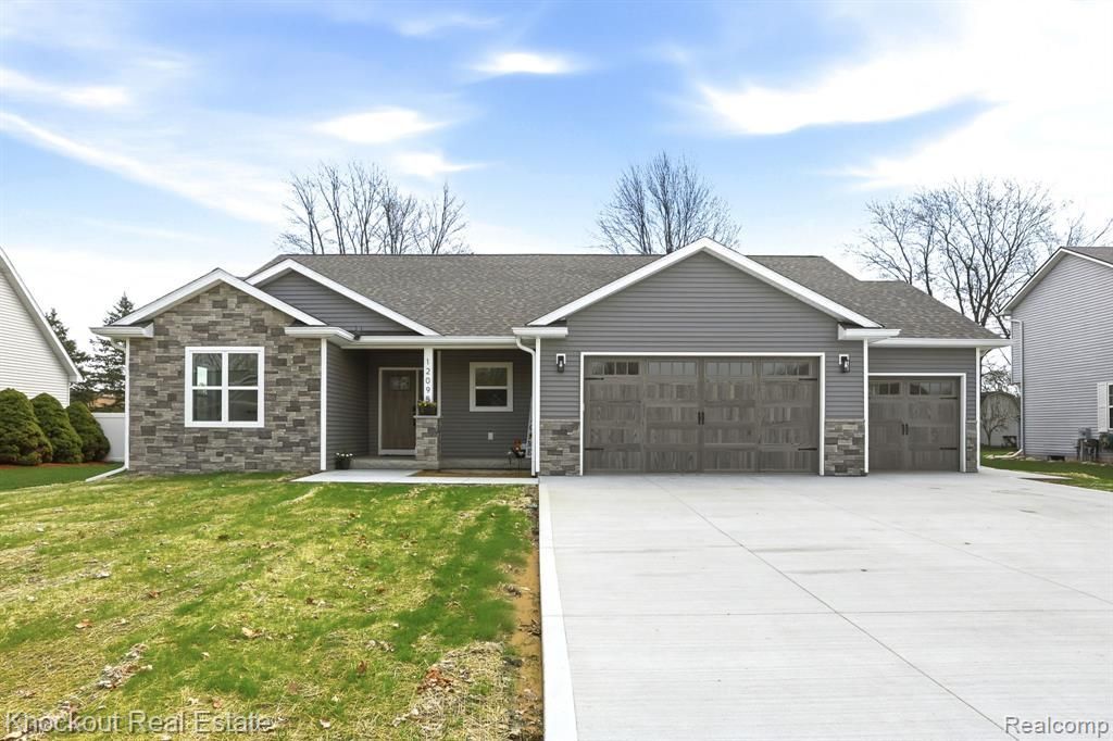 Dust off the grill, plan the summertime party, and put your Pinterest board to work in this new build in Birch Run! Sitting in the desirable Country Run Estates, the "wow" factor starts from the road. Anchored by its stonework and soft-toned siding, open the door and take in that new-build smell, with details far exceeding builder-grade finishes. The home features a chef-grade kitchen with hickory cabinets, quartz countertops, utensils holders, soft-close doors, and even a stowaway cabinet for your trash bin. The hand-painted backsplash is highlighted by cabinet underlighting, adding depth to the kitchen, which also showcases an island with a workstation sink. The pantry is lined with rich, wood-toned shelving and offers excellent space and organization for prep. During get-togethers, conversations flow freely thanks to the open-concept design, with a living room featuring cathedral ceilings and a jaw-dropping gas fireplace with a stone surround. Luxury vinyl flooring runs throughout the home, including into the sizable primary bedroom and bathroom, where you'll find motion-activated lighting perfect for nighttime, two sinks, a soaker tub, a custom walk-in shower, and a walk-in closet with built-in storage solutions already in place. Two additional bedrooms, a full bathroom, a half bath, and a laundry room complete the first floor. Downstairs, a Superior Wall System— a favorite among many builders—makes up the foundation. These walls are already prepped to create a livable space, featuring nine-foot ceilings and room for an additional bedroom with an egress window. The three-car garage offers plenty of space for vehicles and storage, and out back, a covered outdoor living area feels like a true extension of the home, complete with a finished ceiling, fan, and plenty of room to relax or entertain. The yard is seeded, grass is beginning to grow, and it's just waiting for the next owner to grow with it!
