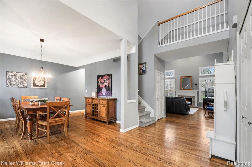 Tucked into the desirable Crossings community, this beautifully maintained colonial welcomes you with warmth, charm, and thoughtful updates throughout. From the moment you enter, hardwood floors and custom shutters set the tone for a home that is both elegant and inviting. The heart of the home is the spacious kitchen, where granite countertops, a built-in desk, and a cozy dining area flow seamlessly into the soaring family room with cathedral ceilings and a fireplace—perfect for everyday living and gathering. A butler’s pantry leads to the formal dining room, while a private office with French doors offers a quiet retreat. The first-floor primary suite provides comfort and convenience, complete with a well-appointed en-suite bath. Upstairs, two additional bedrooms and an updated full bath offer space for family or guests. Downstairs, the finished basement creates the perfect setting for entertaining or relaxing, with room for games, media, and more. With a two-car garage, newer driveway, and inviting outdoor access from the kitchen, this home blends function and lifestyle in one exceptional offering. Enjoy resort-style amenities including a pool, courts, playground, and more. Rochester schools with Delta Kelly Elementary, Van Hoosen Middle, and Adams High School. More features in docs!